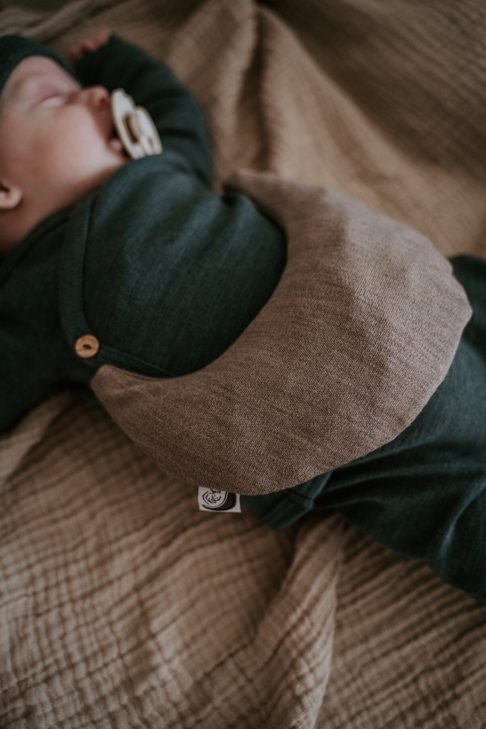 Het Warmtemaantje in merinowol is de moderne en comfortabele variant op de klassieke babykruik. Dit handgemaakte, maanvormige warmte pittenzakje is gevuld met biologisch gereinigde druivenpitten en kan zowel warm als koud gebruikt worden. De zachte merinowollen hoes in de kleur Taupe geeft een warme, rustige uitstraling en maakt het Warmtemaantje niet alleen een fijn hulpmiddel, maar ook een prachtig decoratief item in de babykamer.